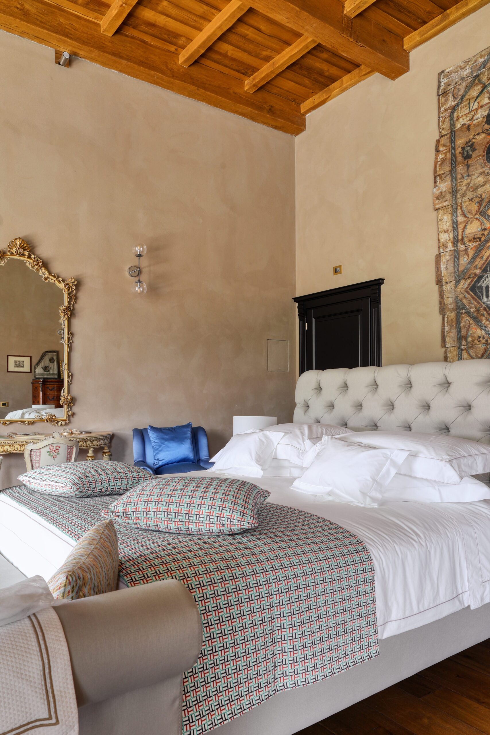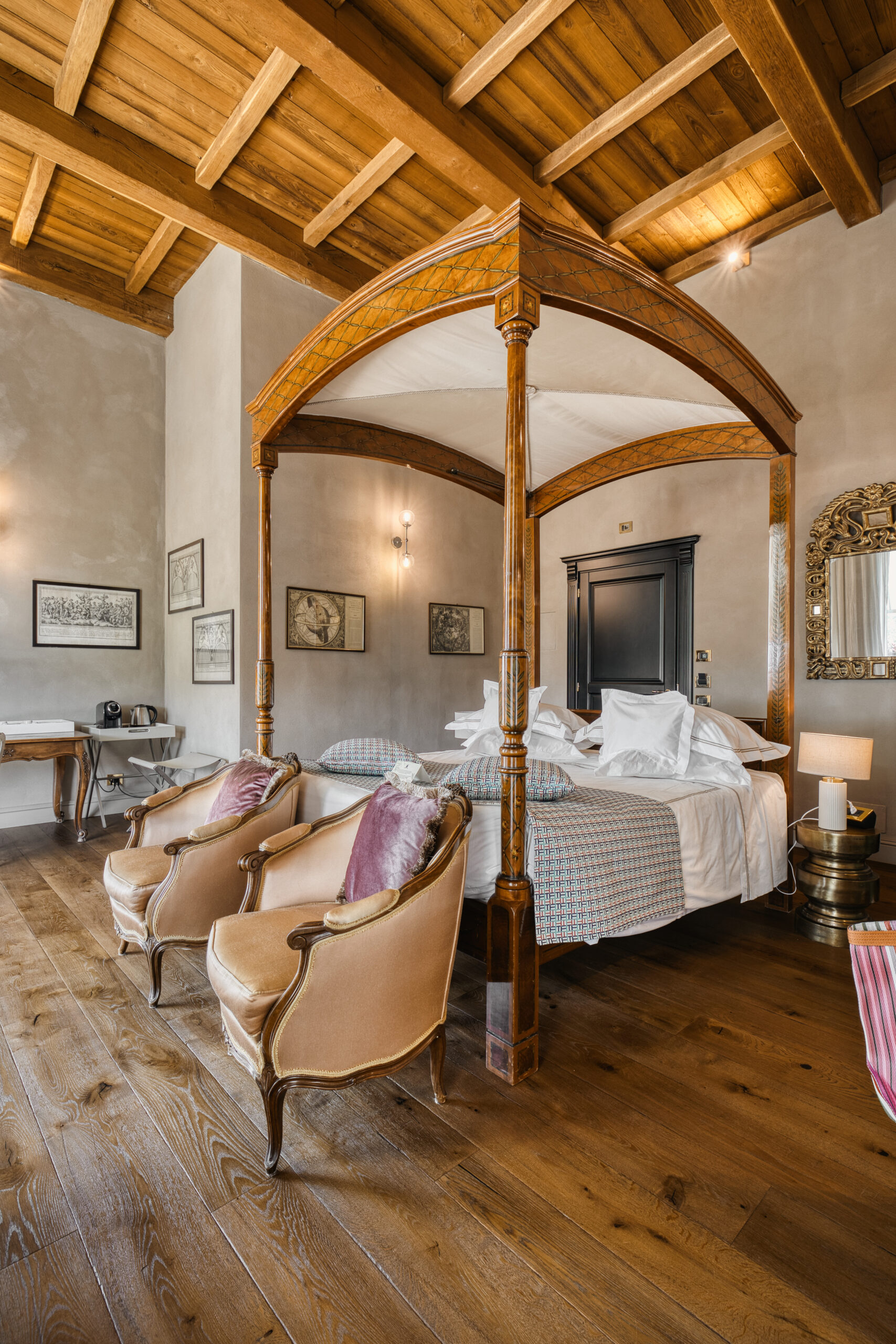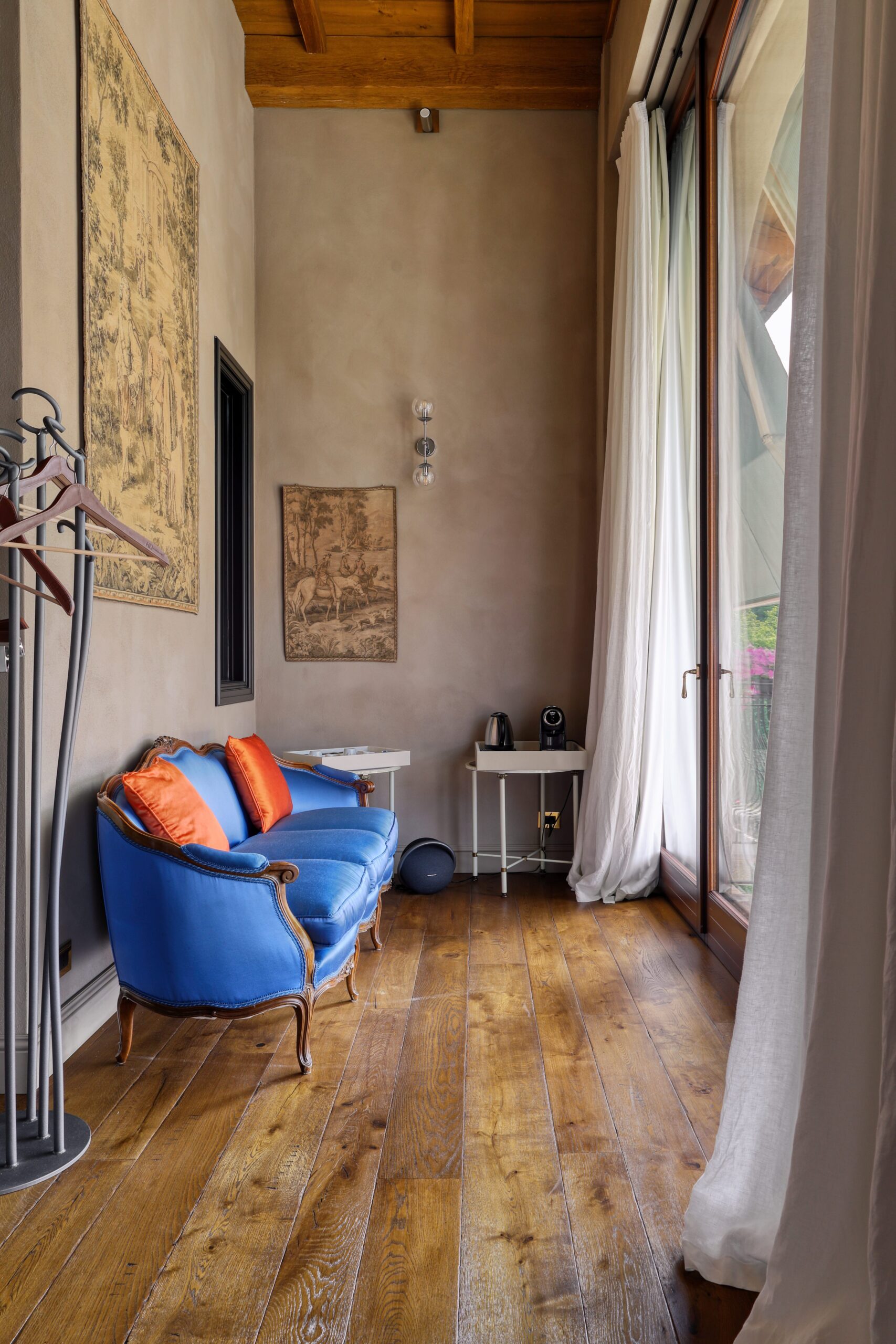 Suite of about 45 square meters. King size bed, small terrace overlooking the garden, coffee and tea machine, Bluetooth speaker.